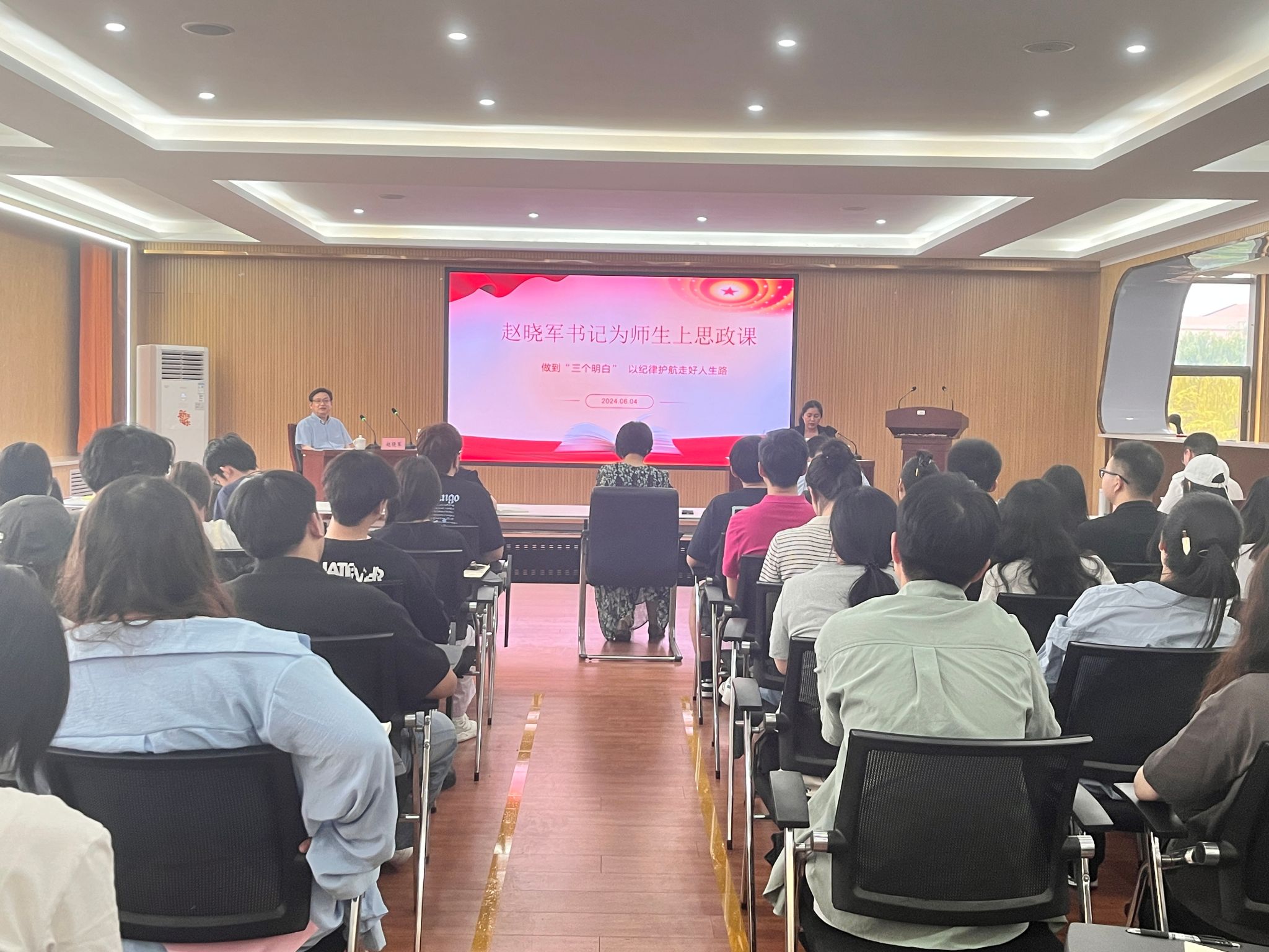 6月4日下午,在文综楼302会议室,校纪委书记、监察专员赵晓军以“做到‘三个明白’ 以纪律护航走好人生路”为题,为学校师生讲授思政课。外国语学院党委书记许荣梅主持。