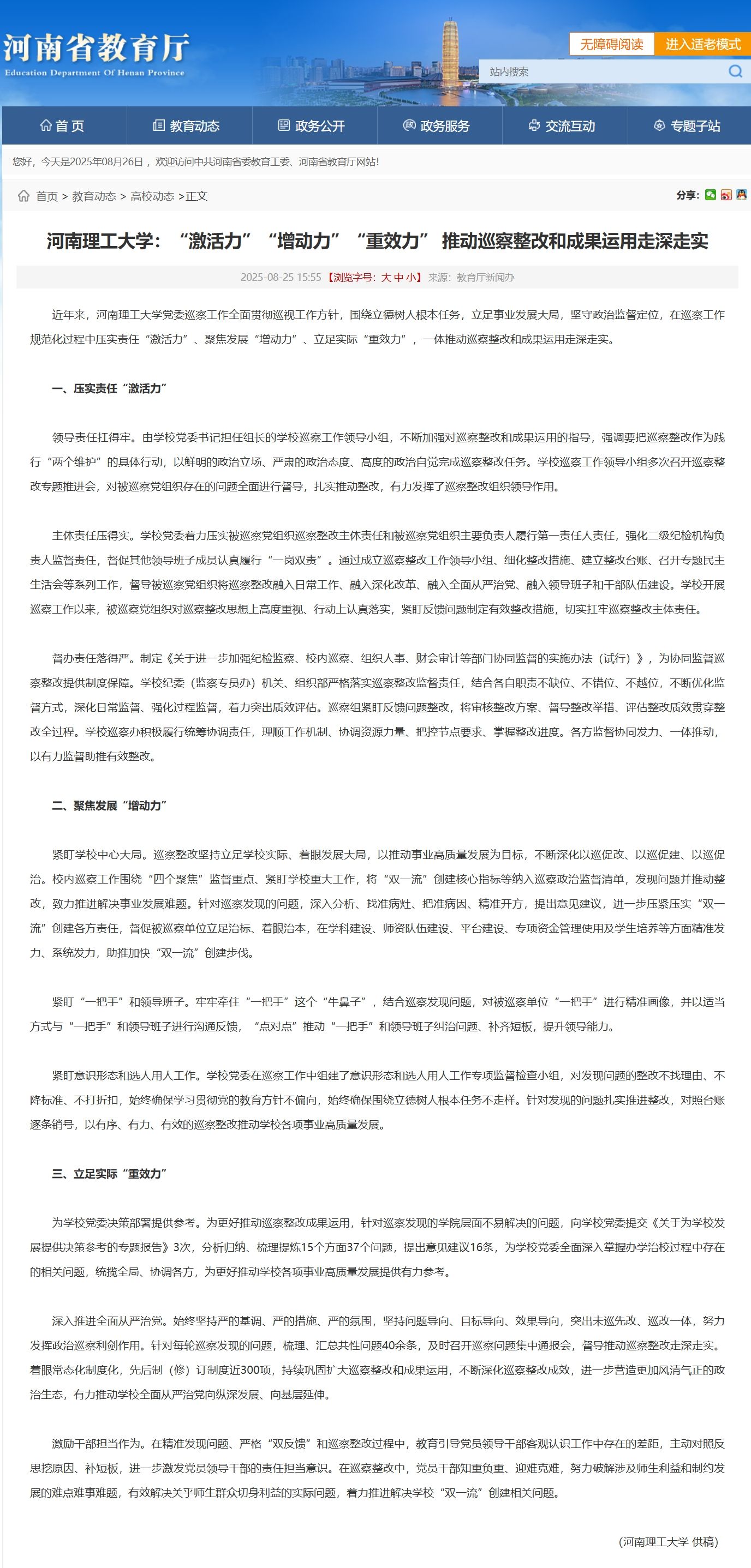 8月25日,河南省教育厅网站以《河南理工大学:激活力、增动力、重效力 推动巡察整改和成果运用走深走实》为标题,报道了我校巡察工作经验做法。